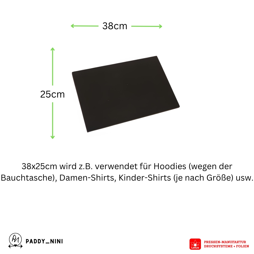 Durch den freistehenden Druckteller kannst du die Textilien bequem aufziehen, während auf der Druckplatte nur der zu bedruckende Bereich aufliegt. Dadurch werden bereits vorhandene Transferdrucke geschont und unschöne Druckfalten vermieden.